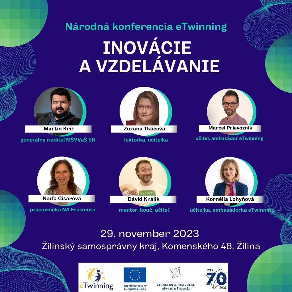 Pozývame vás na Národnú konferenciu eTwinning 2023, ktorá bude zameraná na eTwinning tému roka 2023: Inovácie a vzdelávanie. Jej cieľom je nielen predstaviť eTwinning a úspešne zrealizované projekty, ale aj priniesť zaujímavé informácie ohľadom kurikulárnej reformy, premien školy zvnútra a použitia umelej inteligencie vo vzdelávaní.